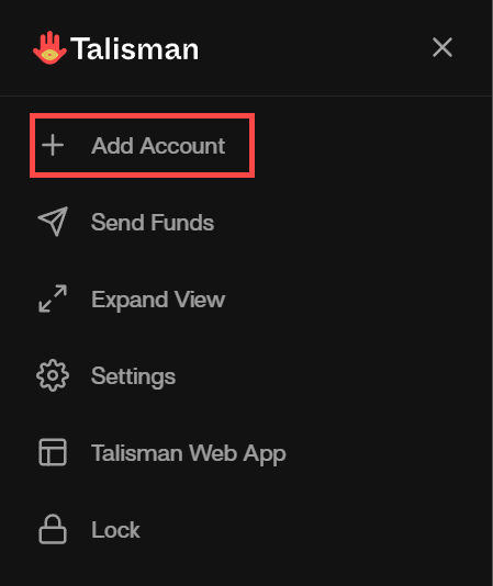 * Onboard Talisman with your original secret phrase as a root account and re-derive these accounts (one-by-one) by clicking "Add Account", then "New account". *Note: The original password will not be required.*&#x20;